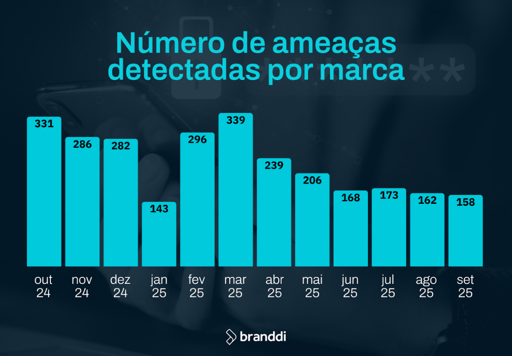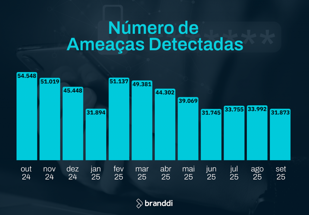 Nos últimos 12 meses, o esquenta da Black Friday de 2024 e o Dia do Consumidor de 2025 foram os períodos com mais registros de novas ameaças detectadas pela Branddi, incluindo os meses anteriores às datas (outubro e fevereiro).